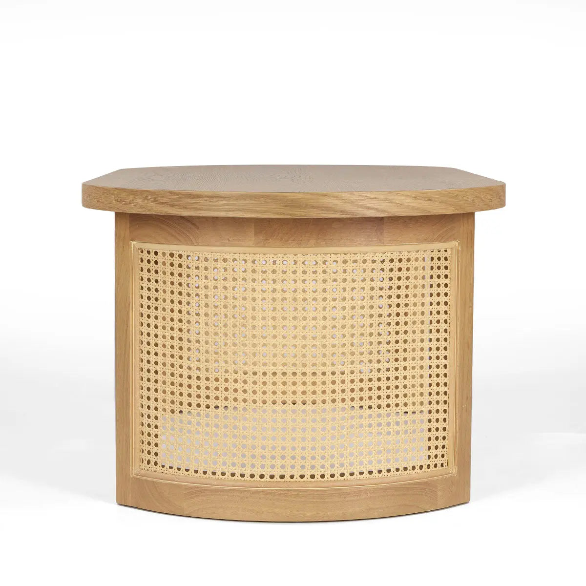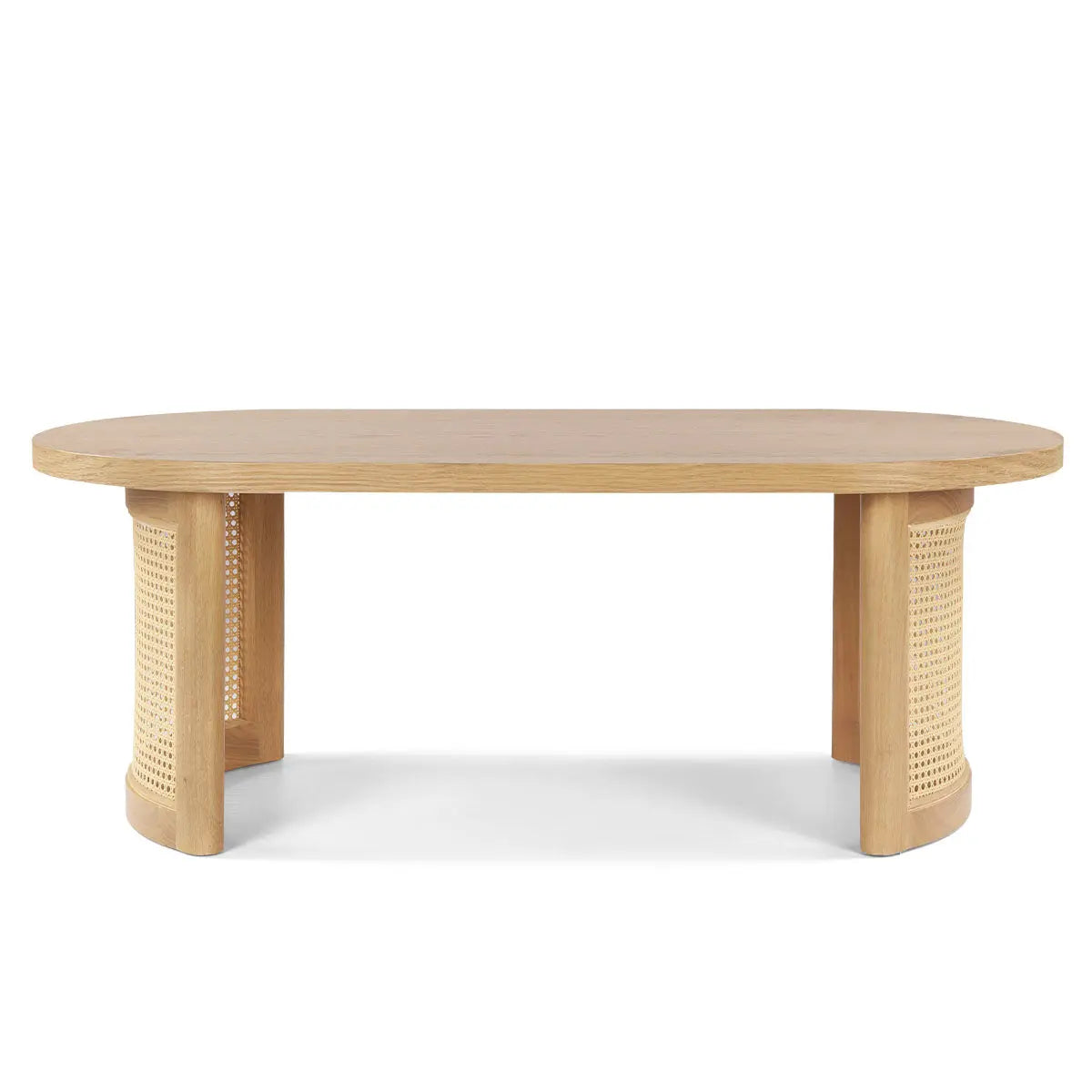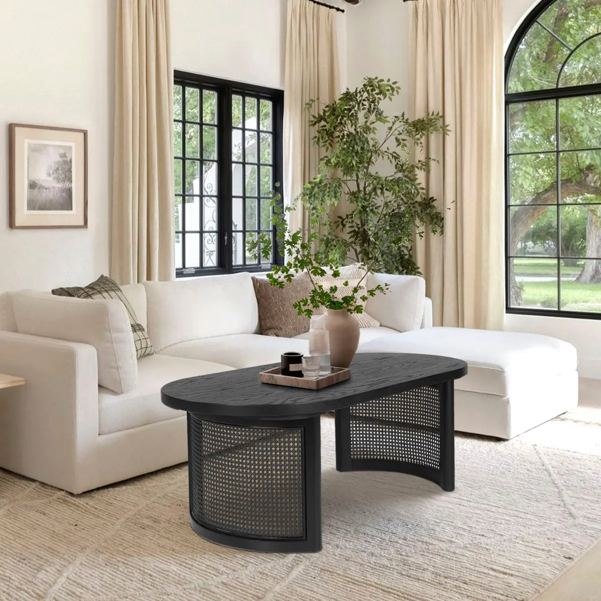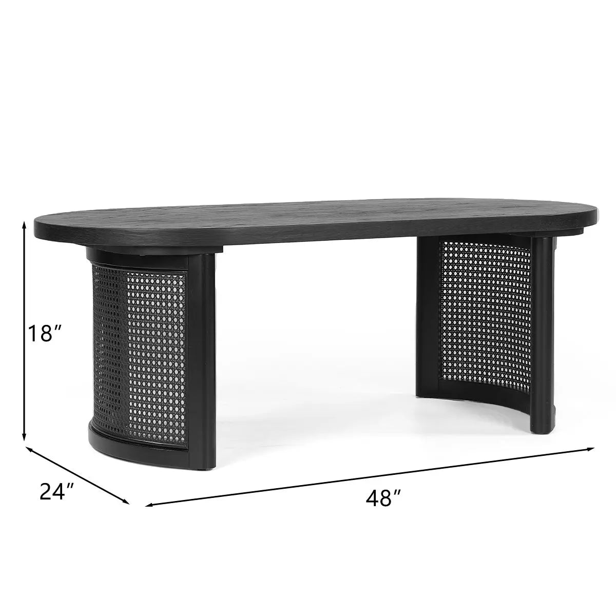This COASTAL style OVAL shape coffee table is so stylish! The RATTAN & SOLID WHITE OAK make this statement piece breathable and modern.The 48" length offers ample tabletop surface for everyday use.