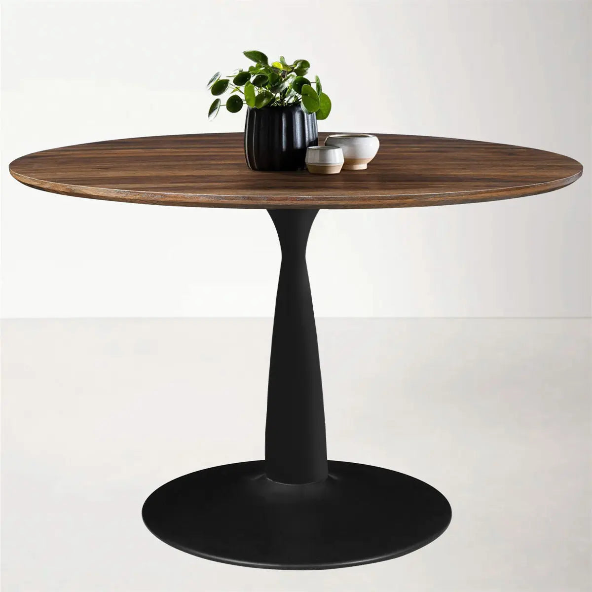 Create a dining space to match your home's charm and character with this pedestal dining table. The high-grade manufactured wood is laminated with gorgeous, rich walnut foil, this finish gives this table natural warmth and texture, while the rounded heavy duty metal base comes in matt black offers a substantial foundation. 40'' L x 40'' W x 30'' H is comfortably fit up to four. The pedestal structure design makes sure all the people around the table have enough space to put their legs in any comfortable position. Keep the simplicity and silhouette into a timeless tale in a style that could easily be the center of attention