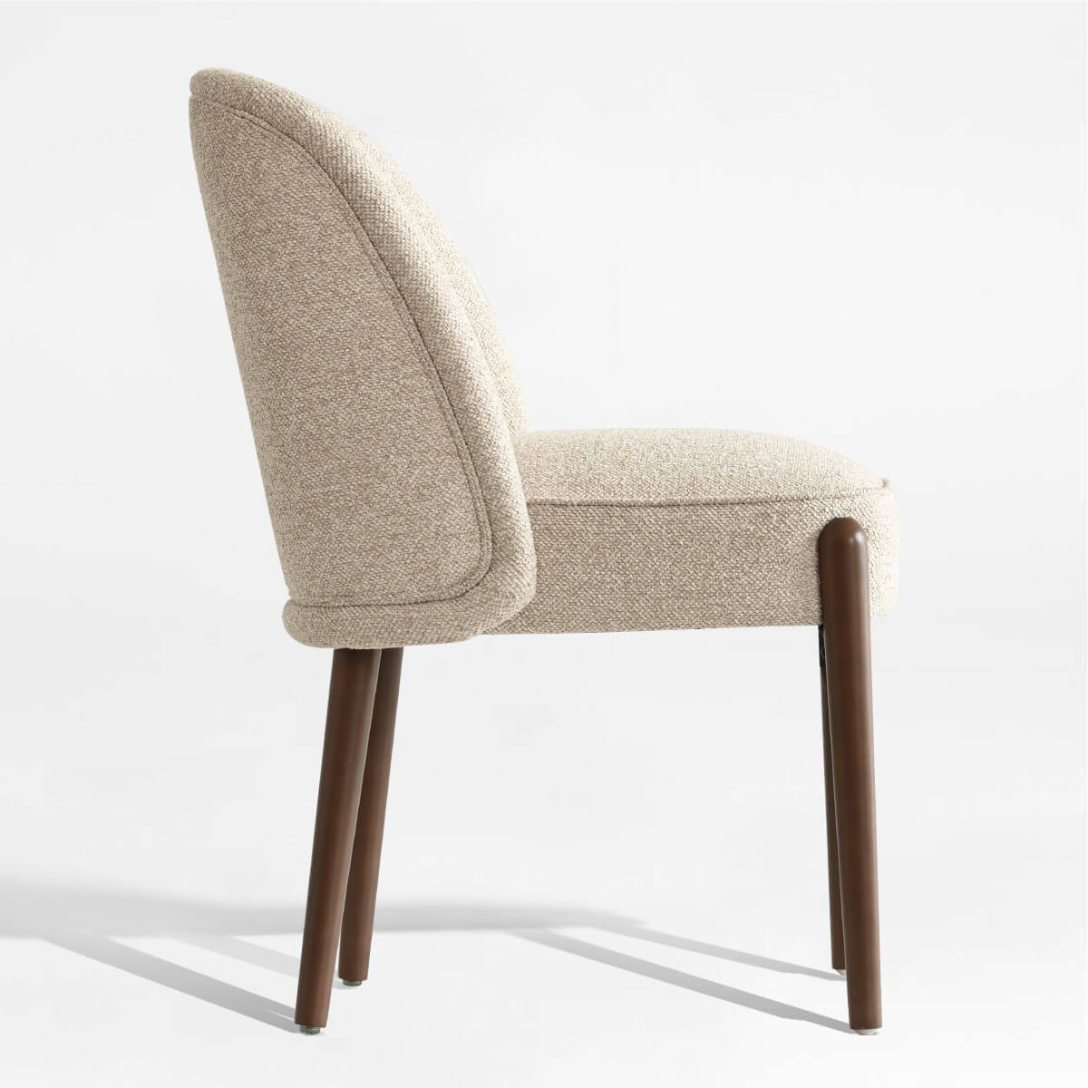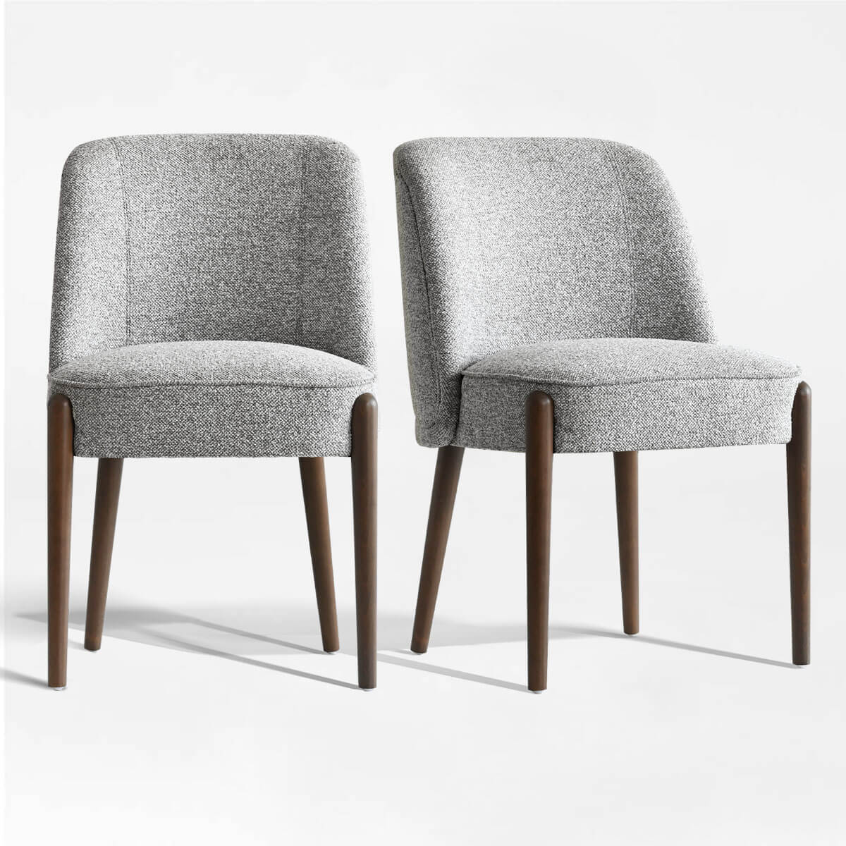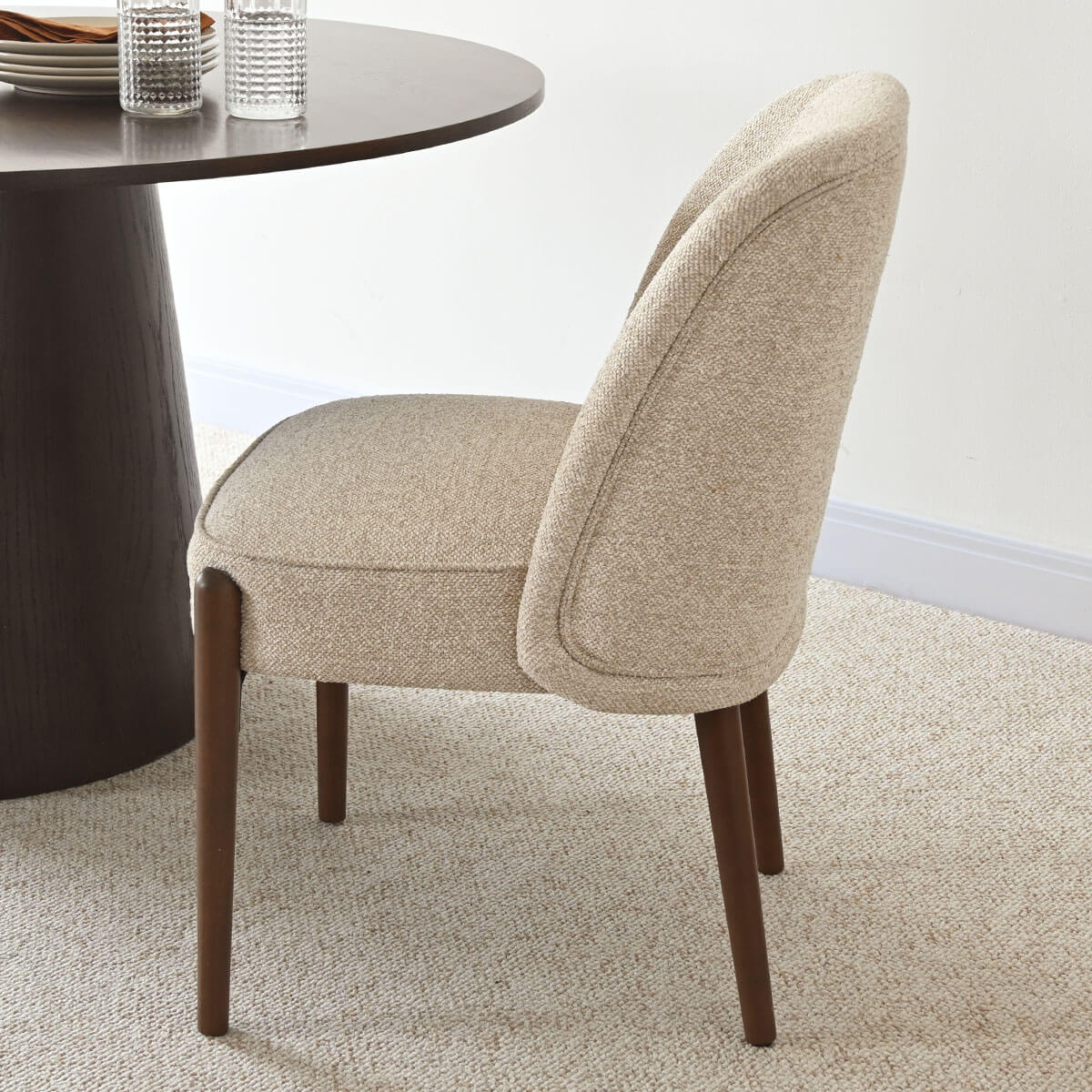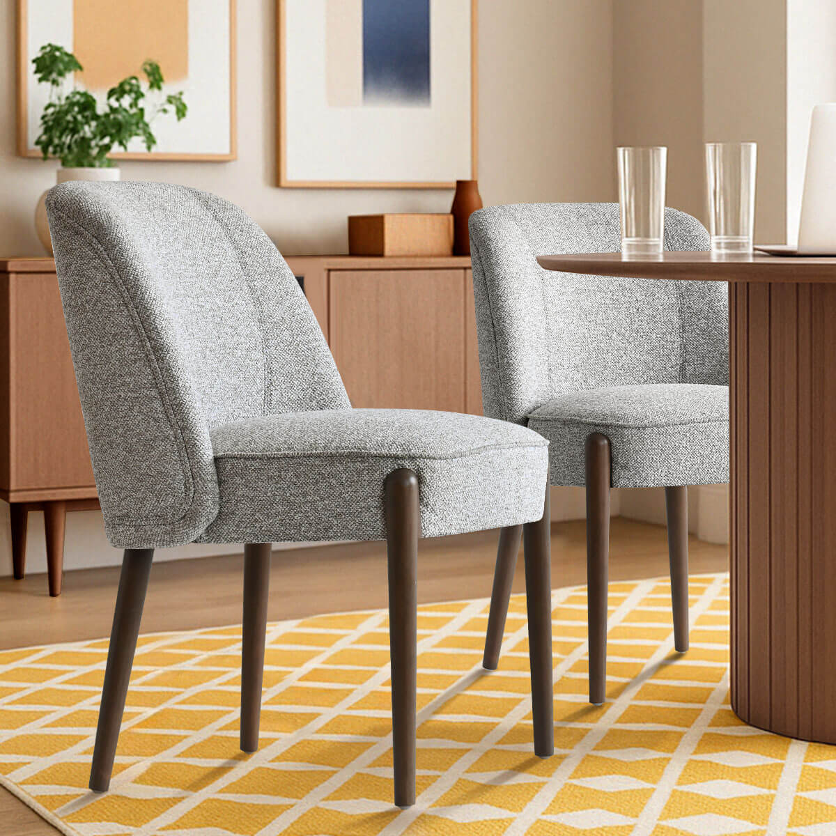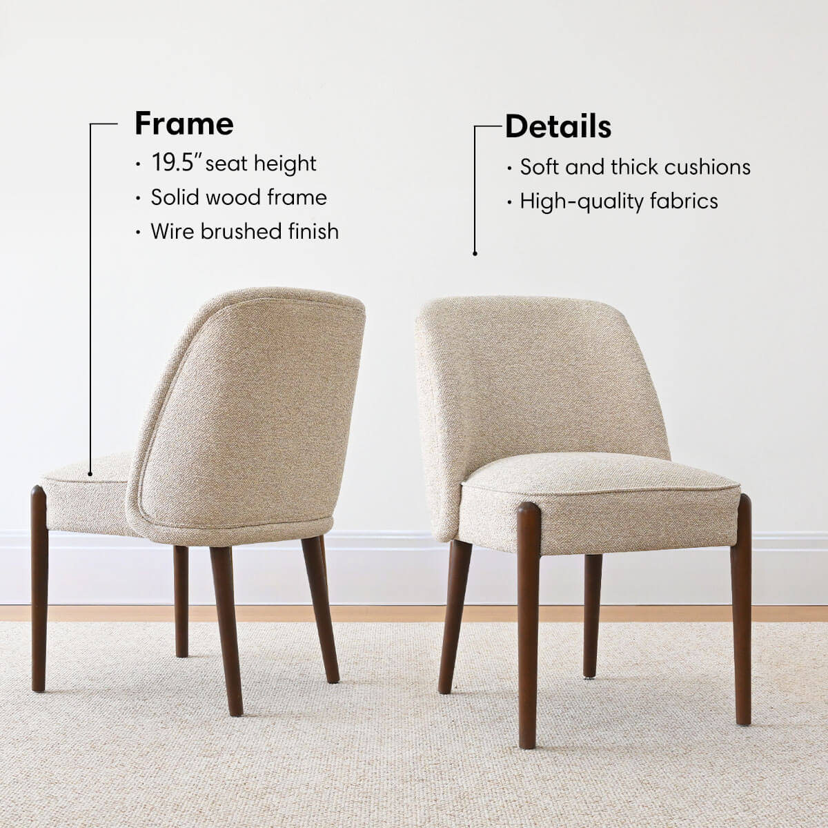 Elevate everyday dining with this duo of upholstered chairs. The luxuriously soft textured fabric feels refined yet inviting, while a wide, curved backrest offers wraparound support that encourages lingering meals and long chats. Beneath, solid beech legs in a warm walnut finish add natural elegance and dependable strength. Whether in the dining room, breakfast nook, or as chic accent seating, these chairs blend comfort, quality, and contemporary style in one effortlessly sophisticated package.