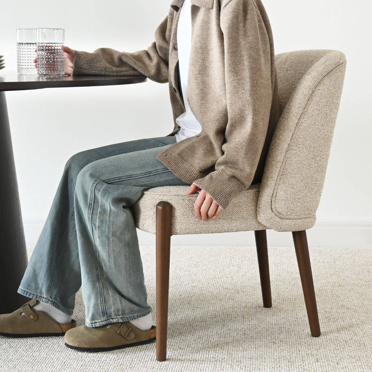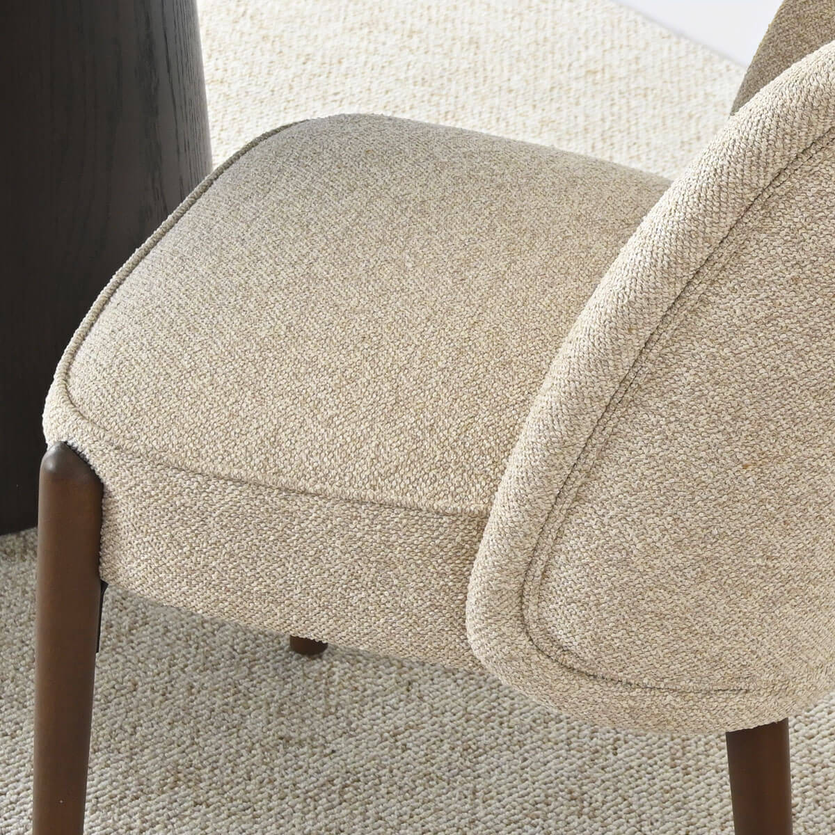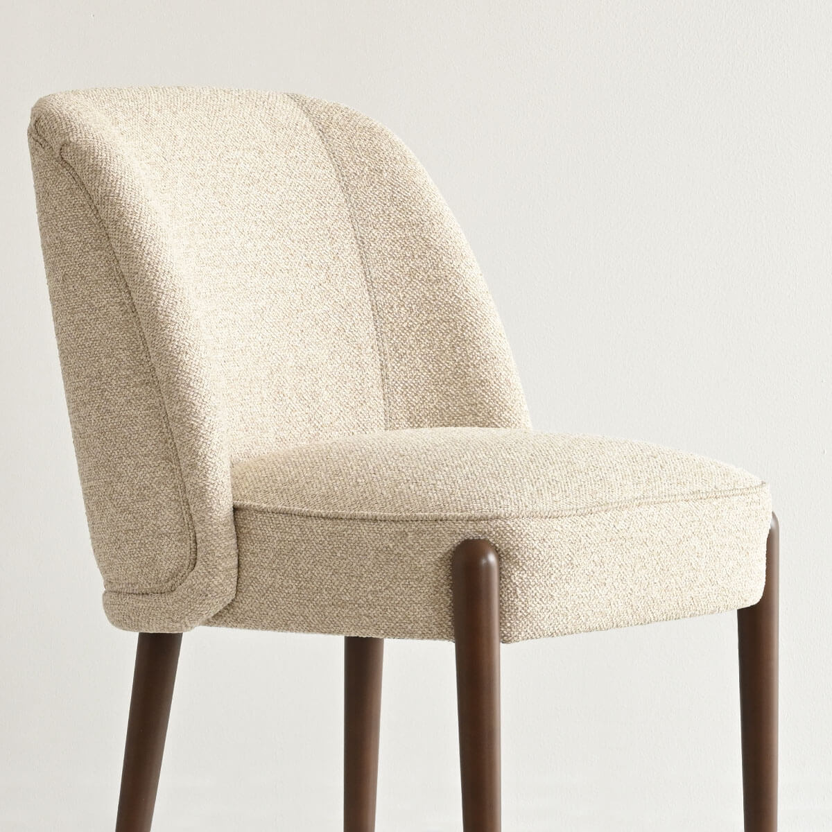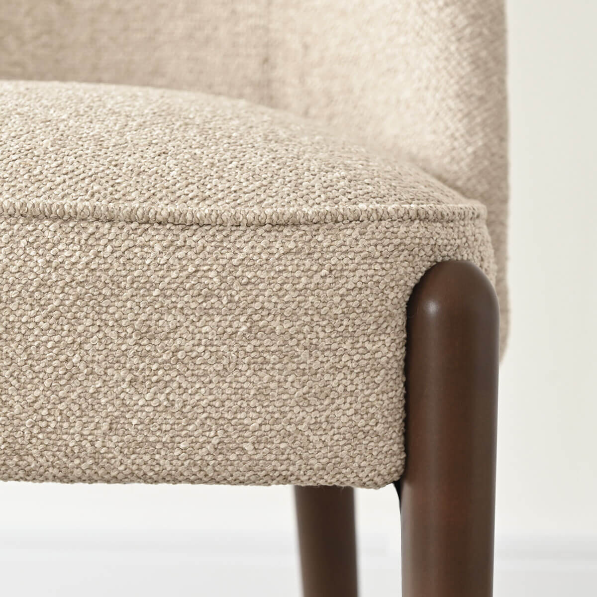 Elevate everyday dining with this duo of upholstered chairs. The luxuriously soft textured fabric feels refined yet inviting, while a wide, curved backrest offers wraparound support that encourages lingering meals and long chats. Beneath, solid beech legs in a warm walnut finish add natural elegance and dependable strength. Whether in the dining room, breakfast nook, or as chic accent seating, these chairs blend comfort, quality, and contemporary style in one effortlessly sophisticated package.