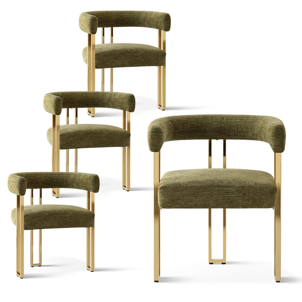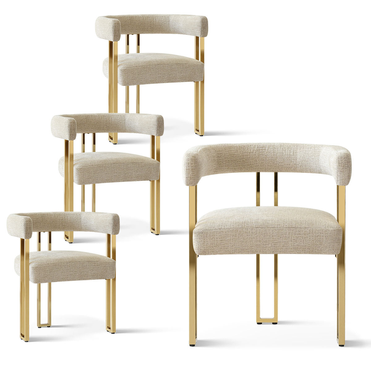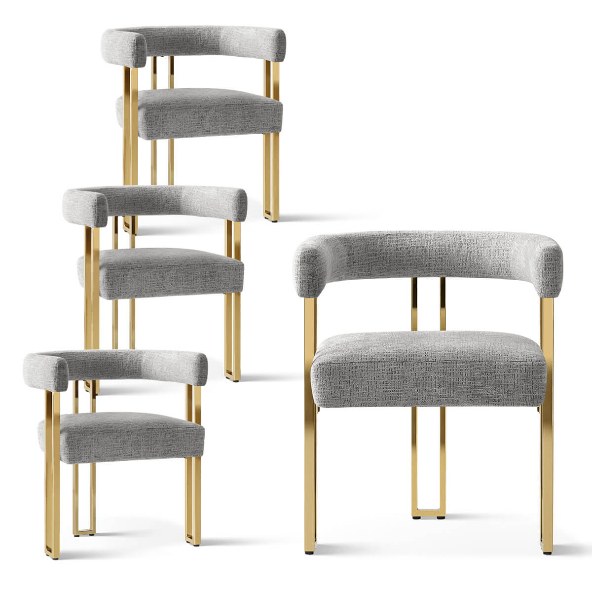 Elevate your dining space with these modern chairs that seamlessly blend style and functionality. Their low-profile design slips easily under your table, keeping the area neat and spacious. A polished gold metal frame, supported by three distinctive sled-inspired legs, adds a touch of refined elegance.Meanwhile, the wooden seat and back are upholstered in soft chenille fabric with foam padding, ensuring luxurious comfort and reliable support for up to 260 pounds per chair. Plus, they’re easy to assemble.