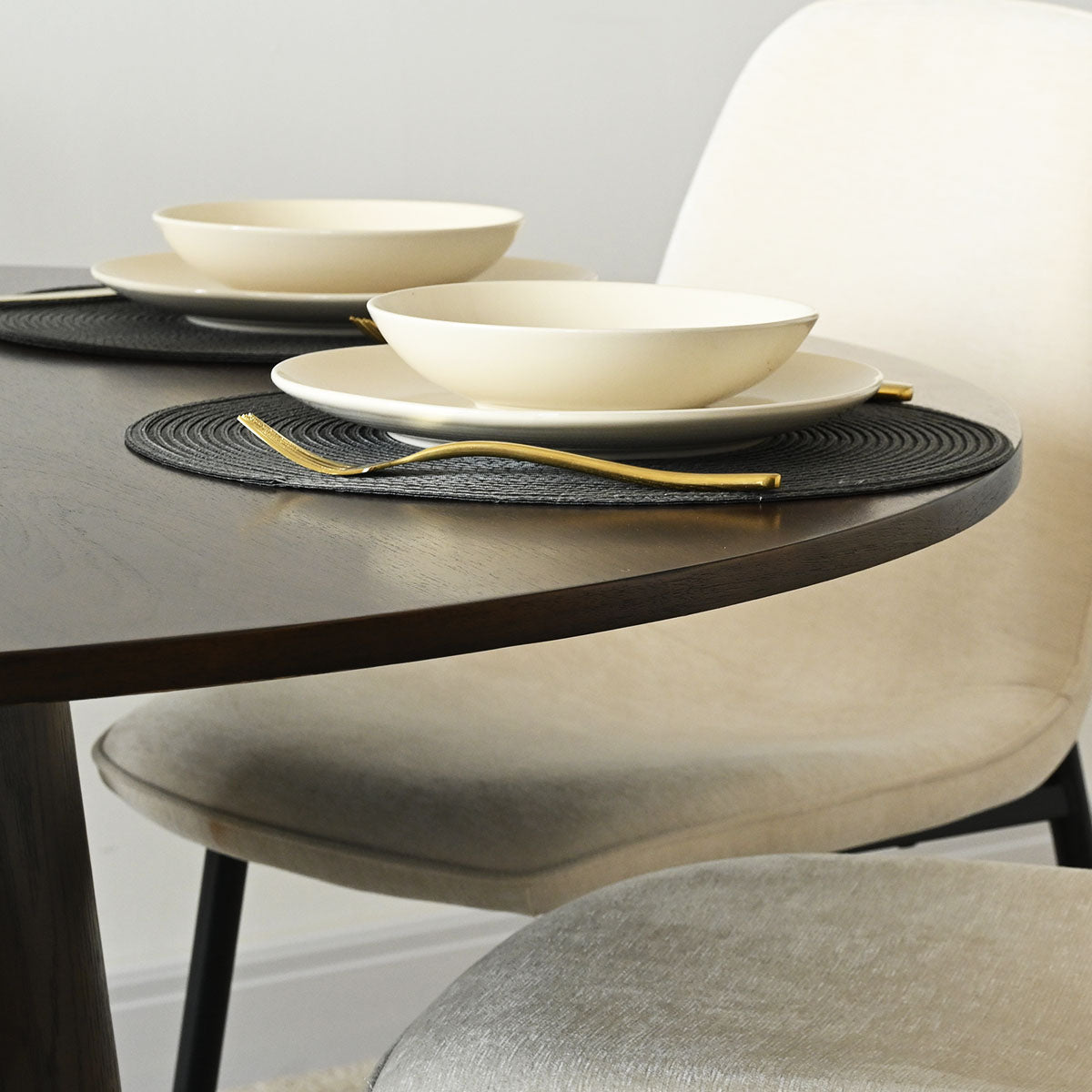 This dining table is crafted from manufactured wood with a genuine white oak veneer, showcasing stunning, natural cathedral wood grain patterns. You'll love how the wood grain stands out—it looks and feels expensive!