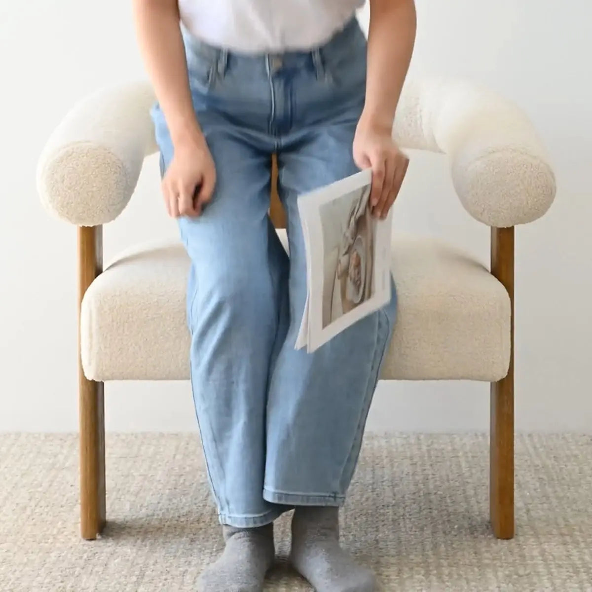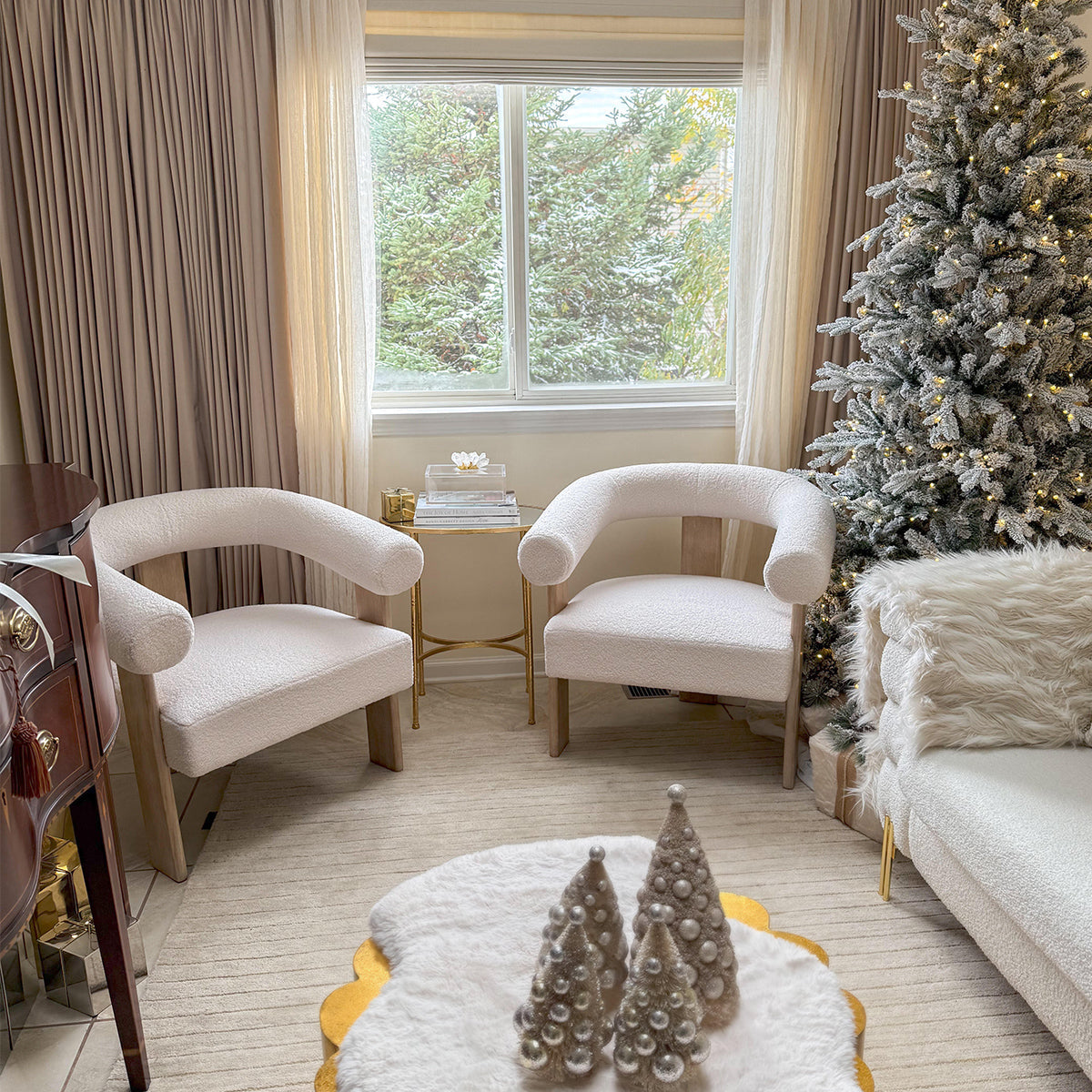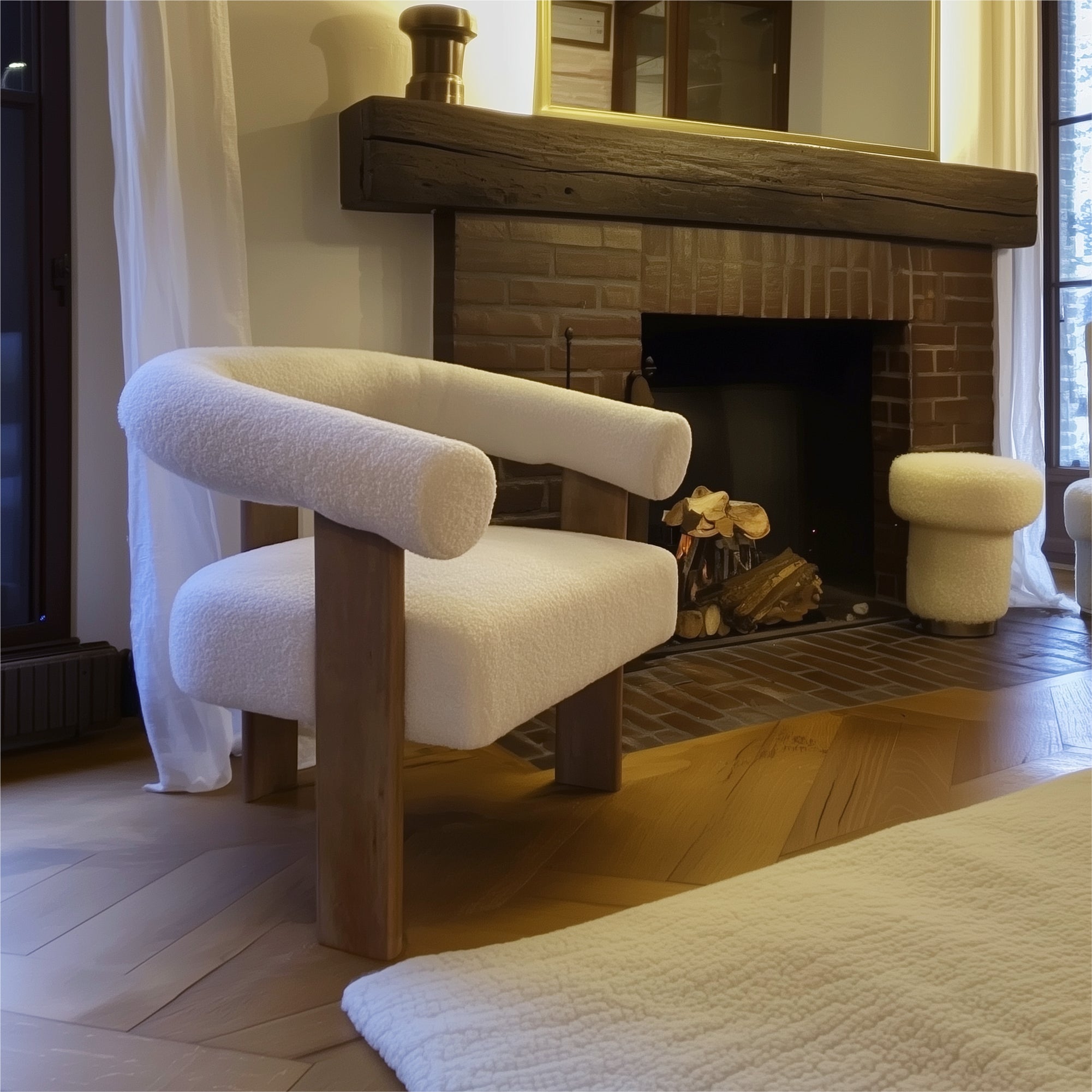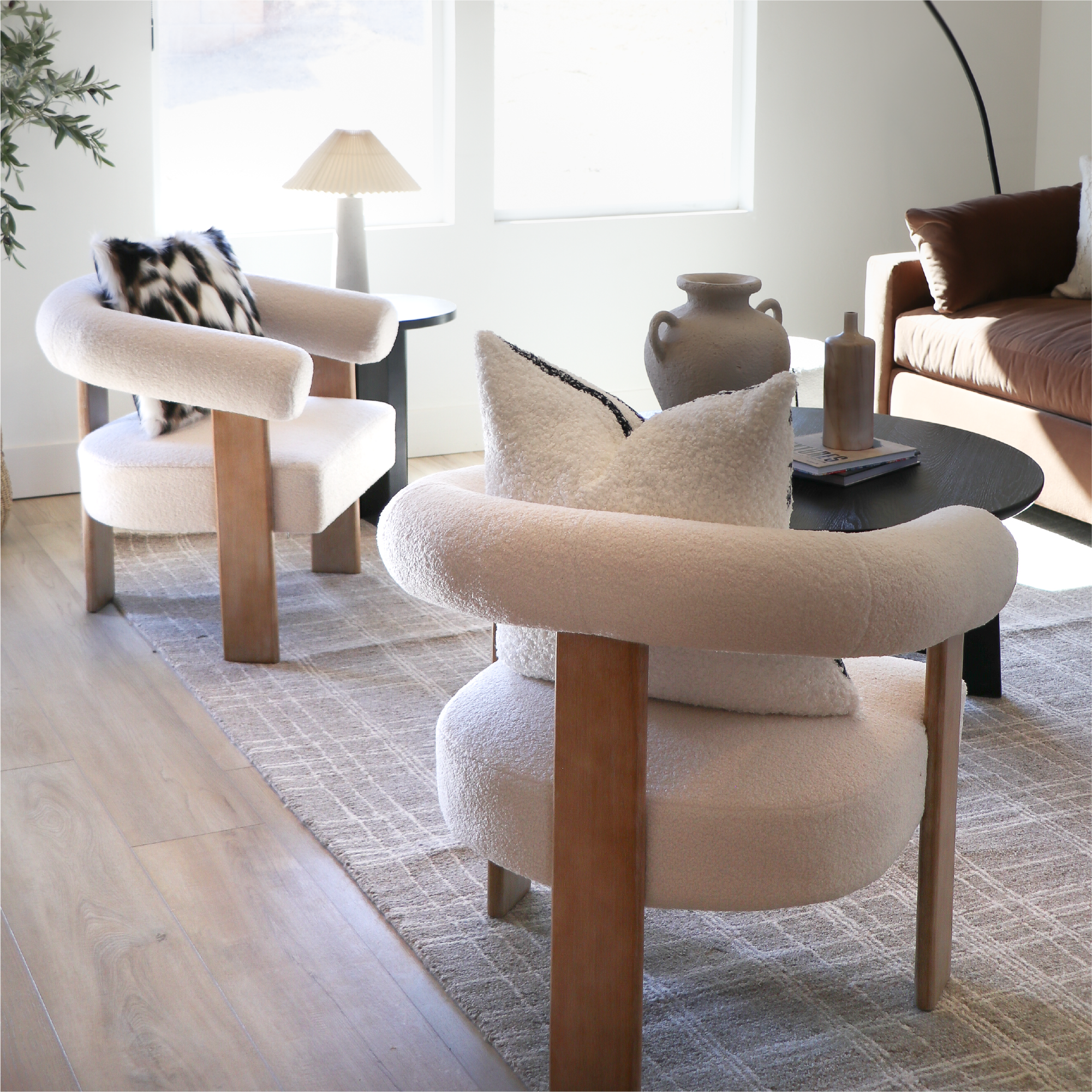 Upholstered in ultra-soft faux sherpa fabric, it's incredibly cozy—and trust us, it's bigger than it looks in the photo! The white-washed rubber wood frame adds a natural, beautiful touch, making this chair a true standout.